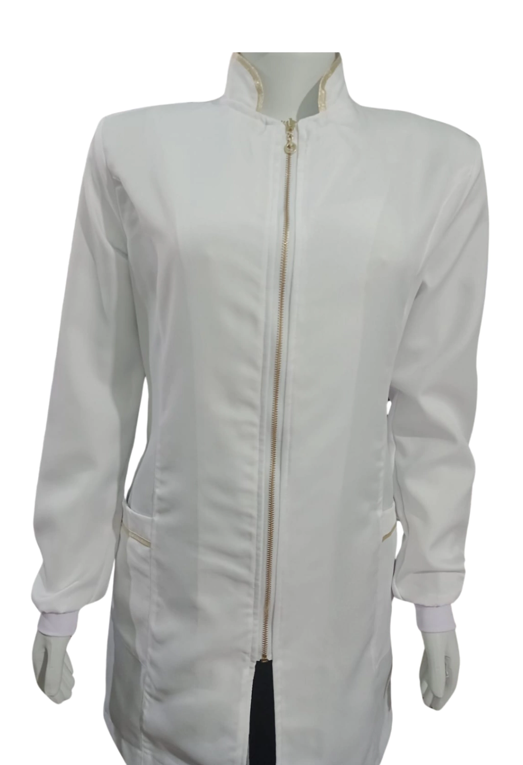 Jaleco feminino branco com detalhes e zíper dourados - tecido GABARDINE COM ELASTANO