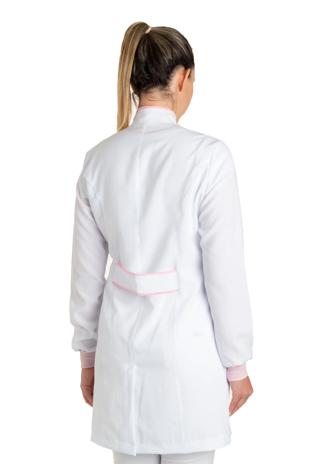 Jaleco feminino branco com viés, botão e punho rosa claro