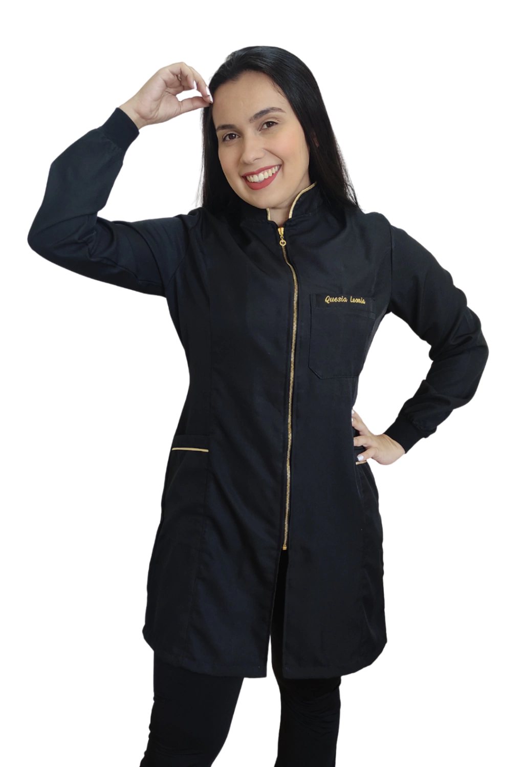 Jaleco Feminino tecido GABARDINE Preto com víes e ziper dourados
